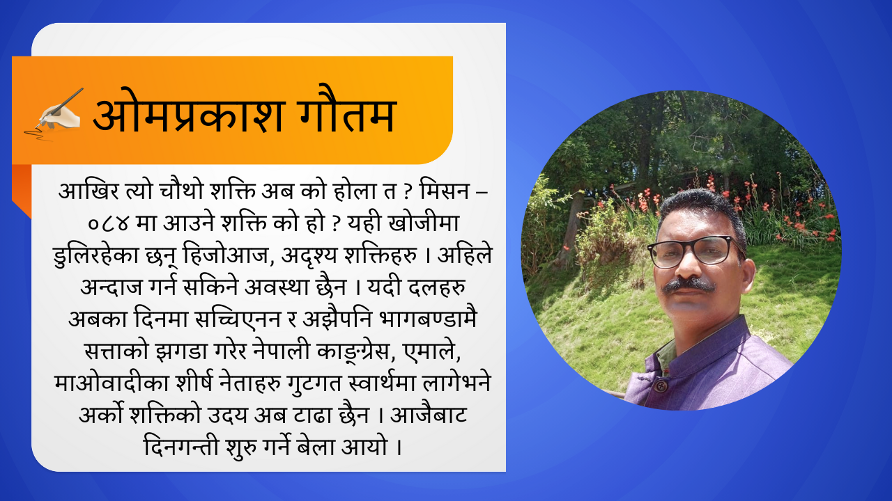 आखिर त्यो चौथो शक्ति अब को होला त ? मिसन – ०८४ मा आउने शक्ति को हो ? यही खोजीमा डुलिरहेका छन् हिजोआज, अदृश्य शक्तिहरु । अहिले अन्दाज गर्न सकिने अवस्था छैन । यदी दलहरु अबका दिनमा सच्चिएनन र अझैपनि भागबण्डामै सत्ताको झगडा गरेर नेपाली काङ्ग्रेस, एमाले, माओवादीका शीर्ष नेताहरु गुटगत स्वार्थमा लागेभने अर्को शक्तिको उदय अब टाढा छैन । आजैबाट दिनगन्ती शुरु गर्ने बेला आयो ।