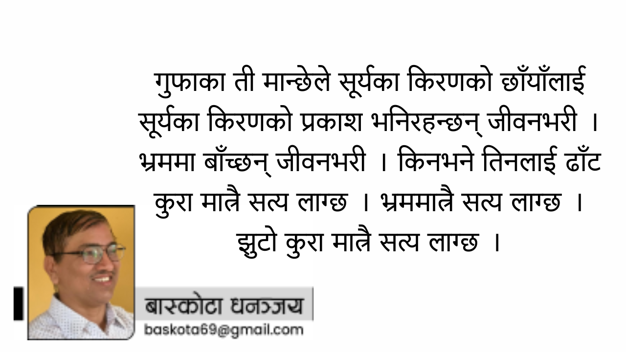 तर यी कुनै पनि छैनन् यथार्थमा । यी सबै उल्टो छन् । यिनले कालो ढाँट गरेका हुन् । तर यिनले समाजको दलीयकरण गरेर त्यो कालो झुटोलाई साँचो मानिरहेका छन् । भ्रमलाई सत्य ठानिरहेका छन् । लोकतन्त्र र गणतन्त्र एउटै हो भनेर बालकपन देखाइरहन्छन् । प्लेटोको गुफाका मान्छे जस्तै । गुफाका ती मान्छेले सूर्यका किरणको छायाँलाई सूर्यका किरणको प्रकाश भनिरहन्छन् जीवनभरी । भ्रममा बाँच्छन् जीवनभरी । किनभने तिनलाई ढाँट कुरा मात्रै सत्य लाग्छ । भ्रममात्रै सत्य लाग्छ । झुटो कुरा मात्रै सत्य लाग्छ । माथि शेक्सपियरको कविताको प्रेमीप्रेमीका जस्तै । तर तिनको झुटमा पवित्र प्रेम थियो ।