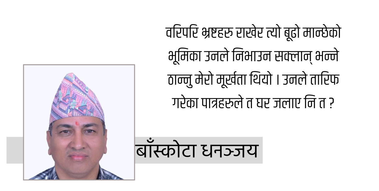 अर्थात् मैले प्रधानमन्त्री केपी ओलीलाई यिट्सको त्यो नाटकको पात्र ‘बूढो मान्छे’ को बिम्बमा देखिरहेको थिएँ उसबेला । घर, घरको सभ्यता, संस्कृति र विरासत जलाउनेहरुलाई ‘नछोडने’ पात्रको रुपमा म हेर्न चाहिरहेको थिएँ उसबेला । वरिपरि भ्रष्टहरु राखेर त्यो बूढो मान्छेको भूमिका उनले निभाउन सक्लान् भन्ने ठान्नु मेरो मूर्खता थियो । उनले तारिफ गरेका पात्रहरुले त घर जलाए नि त ? अब उनले के गर्लान्, हेर्न बाँकी छ । किनभने कांग्रेसको घर हिजोदेखि दीगो छैन । जतापनि बस्न मिलाएको छ । त्यो ‘नेहरु डक्ट्रीन’ को परिणाम हो, किनभने त्यही डक्ट्रीनले ऊ जन्मिएको हो । माओवादी केन्द्र ‘श्यामशरण र मनमोहनसिंह डक्ट्रीन’ मा जन्मिएको हुनाले त्यसको घर पनि यकिन छैन । त्यसो त माक्र्सको मेनिफेस्टोमा त ‘यो संसार नै सर्वहाराको देश हो’ भनेर राज्यबिहीनता बोले । अथर्ात ‘घरबिहीनता’ बोले । तिनले आप्mनो घर बनाउने मन्त्रै पढेका छैनन् । शूत्रै पढेका छैनन् । त्यसैले यो घर पनि यिट्सको नाटकको घर जस्तै त्यही घरका मूलीहरुले आगो लगाइदिएका छन् । जातीयताको आगो । पहिचानको आगो । धर्मको आगो । भ्रष्टाचारको आगो । राज्यसंयन्त्रमाथि कब्जा गरेको आगो । दलमात्र मोटाएर देश लुते बनाउने दलहरुको आगो । कर्मचारीको आगो । शिक्षकको आगो । सारा सामाजिक संस्थाहरुमा राजनीतिको आगो ।
