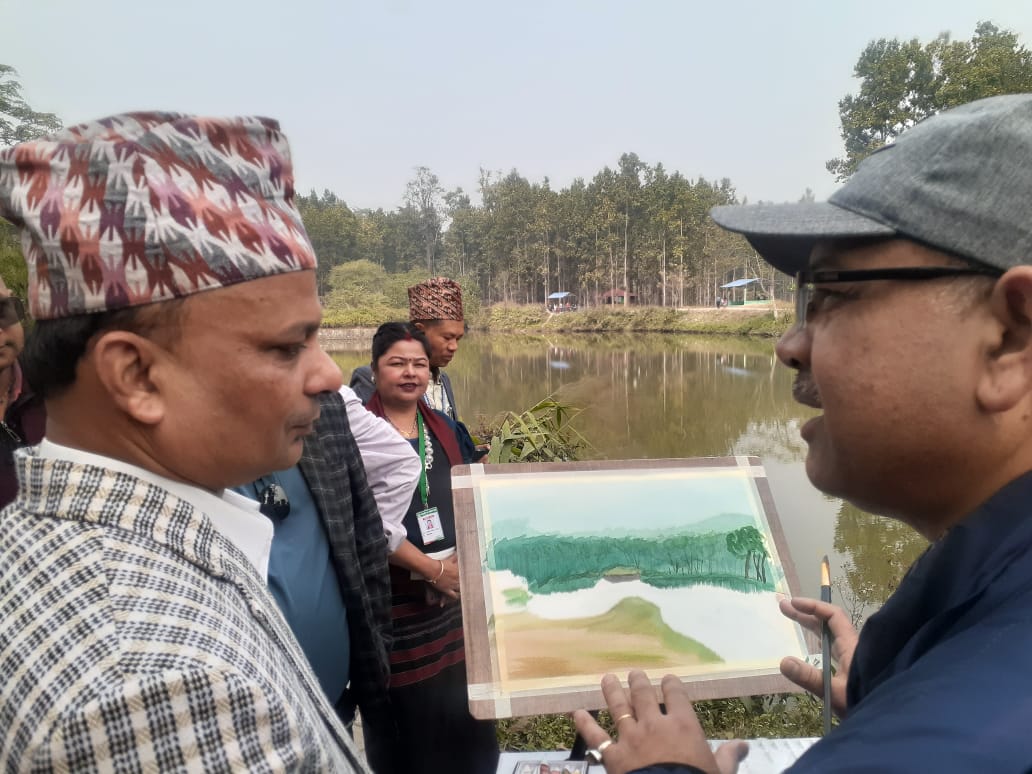 अनौपचारिक रुपमै हात्तीको आकृति अनावरण गरेका मन्त्री उप्रेतीले त्यसपछि सिमसार परिसरमा सञ्चालित विद्यालयस्तरीय चित्रकला प्रतियोगिताको अवलोकन गरे । अनि अलि पर कलाकारहरुले सिमसारको डिलमा निर्माण गरेका सिमसार सहित प्रकृति संरक्षणको भाव बोकेका चित्रहरु पनि अवलोकन गरे । अष्ट्रेलियाबाट आएका चित्रकार रे मर्सदेन सहितका चित्रकारहरुको त्यसखाले कलाका बारेमा चासो लिएर हेर्दै कुराकानी समेत गरे । ‘पर्यावरण संरक्षणको सन्देश दिने यस्ता निधिको प्रवद्र्धनमा मन्त्रालय लाग्छ ।’– साहित्यकार समेत रहेका उनले संक्षिप्त प्रतिक्रिया दिए ।