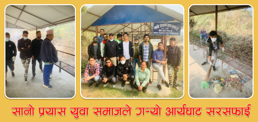 दमक/ दमक ५ स्थित सानो प्रयास युवा समाजले प्रजातन्त्र दिवसको अवसर पारेर सोमबार सरसफाई कार्यक्रम सम्पन्न गरेको छ । संस्थाले दमक २ को वेलडाँगी आर्यघाट सरसफाई गर्नुका सार्थ सचेतनामूलक बोर्ड र फोहोर ब्यवस्थापन गर्ने डस्वीन राख्नेकाम गरेको संस्थाका अध्यक्ष छवि खतिवडाले जानकारी दिए ।