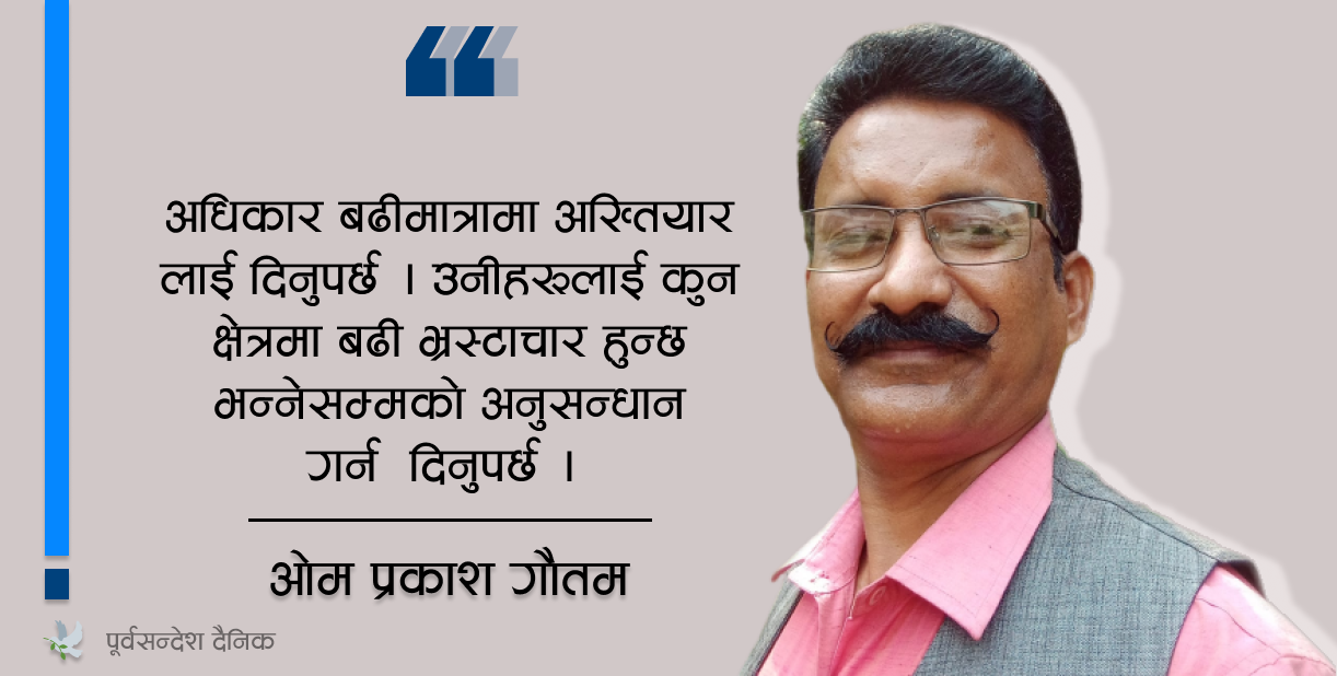 अधिकार बढीमात्रामा अख्तियारलाई दिनुपर्छ । उनीहरूलाई कुन क्षेत्रमा बढी भ्रस्टाचार हुन्छ भन्नेसम्मको अनुसन्धान गर्न दिनुपर्छ । साथै राष्ट्रिय सतर्कता केन्द्रलाई अधिकार दिएर भ्रष्टाचार नियन्त्रणको स्वतन्त्र तरिकाले प्रयास गर्नुपर्छ । भ्रष्टाचारमा राजनीतिक संरक्षण नहुने हो भने स्वत ः भ्रष्टाचार न्यूनीकरण भएर जान्छ । हिजोआज भ्रष्टाचार गरेर अकुत सम्पत्ति कमाएकाहरु यत्रतत्र देखिन्छन् । आज यसरी नै नेता बचाउ अभियानमा स्वयं तीन दलका नेताहरु नै सक्रिय देखिएका छन् । उनीहरूको बदनियतपूर्ण यो कर्मले गर्दा आज नेपाली जनतामा निरासा छाउँदै गएको छ र जनमत पनि अदलबदल भएको छ । ब्यालेट पेपरमा जनमत ठूला दलहरुप्रति छँदैछैन । अहिले जनतामा नेताहरुप्रति देखिएको आक्रोशको बेगलाई मत्थर बनाउन सचेत दल र कार्यकर्ताहरु लागेमात्र जनताका निराशाहरु क्रमशः हटेर जानेछन् । यसकारणले हिजोदेखि आजका मितिसम्म भ्रष्टाचार गरेर ब्रह्मलुट गर्ने भ्रष्ट नेताहरु कानुनी कठघरामा पर्नैपर्छ । सबलाइ चेतना भया ।