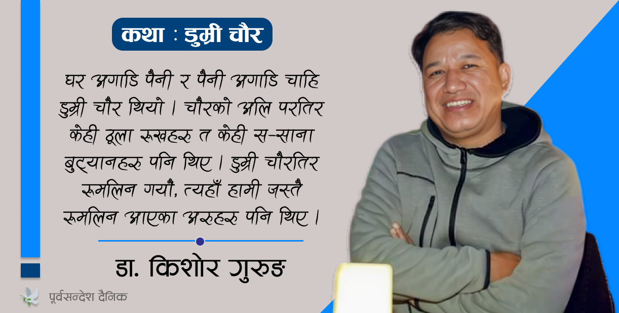 घर अगाडि पैनी र पैनी अगाडि चाहि डुम्री चौर थियो । चौरको अलि परतिर केही ठूला रुखहरू त केही स–साना बुट्यानहरू पनि थिए । डुम्री चौरतिर रुमलिन गयौं, त्यहाँ हामी जस्तै रुमलिन आएका अरूहरू पनि थिए । रात पर्न थालेकोले गर्दा हामी घर तिर लाग्यौं । मेरा लागि राशिकाले उनकै कोठामा सुत्ने व्यवस्था मिलाएको रहेछ, उ र म धेरै कुराकानी गरेर सुत्यौं ।