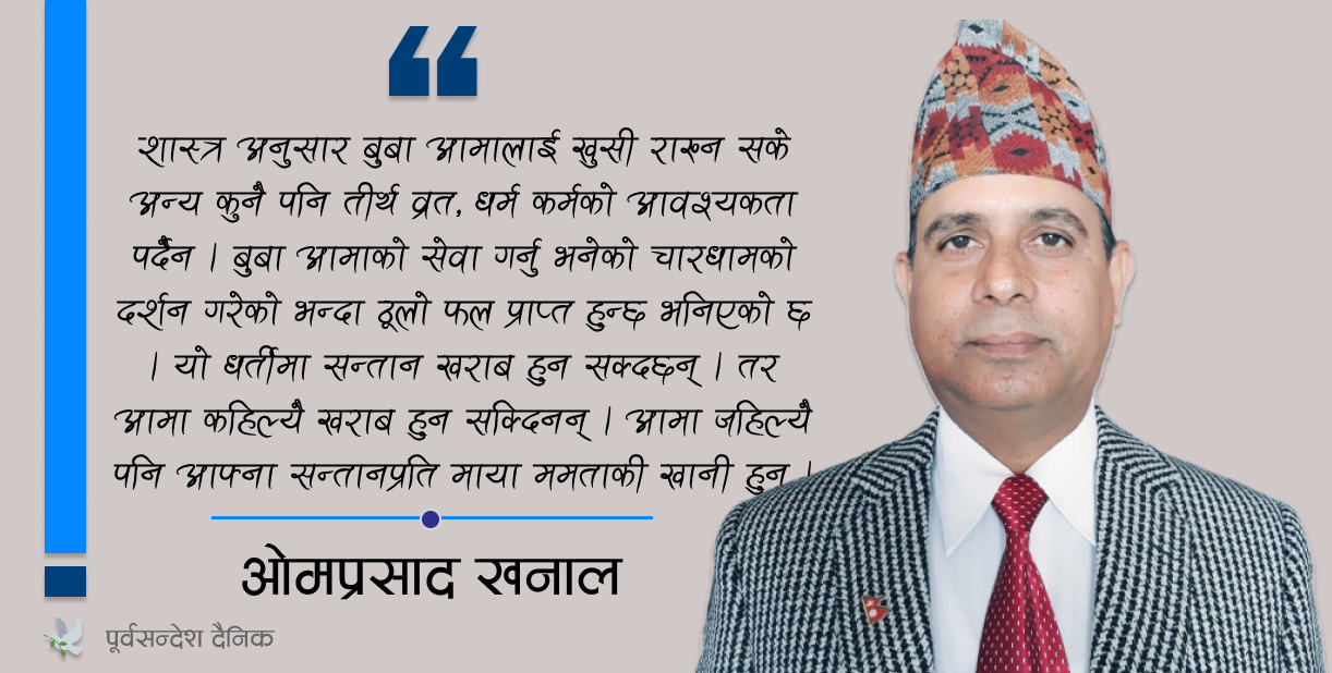 शास्त्र अनुसार बुबा आमालाई खुसी राख्न सके अन्य कुनै पनि तीर्थ व्रत, धर्म कर्मको आवश्यकता पर्दैन । बुबा आमाको सेवा गर्नु भनेको चारधामको दर्शन गरेको भन्दा ठूलो फल प्राप्त हुन्छ भनिएको छ । यो धर्तीमा सन्तान खराब हुन सक्दछन् । तर आमा कहिल्यै खराब हुन सक्दिनन् । आमा जहिल्यै पनि आफ्ना सन्तानप्रति माया ममताकी खानी हुन् ।