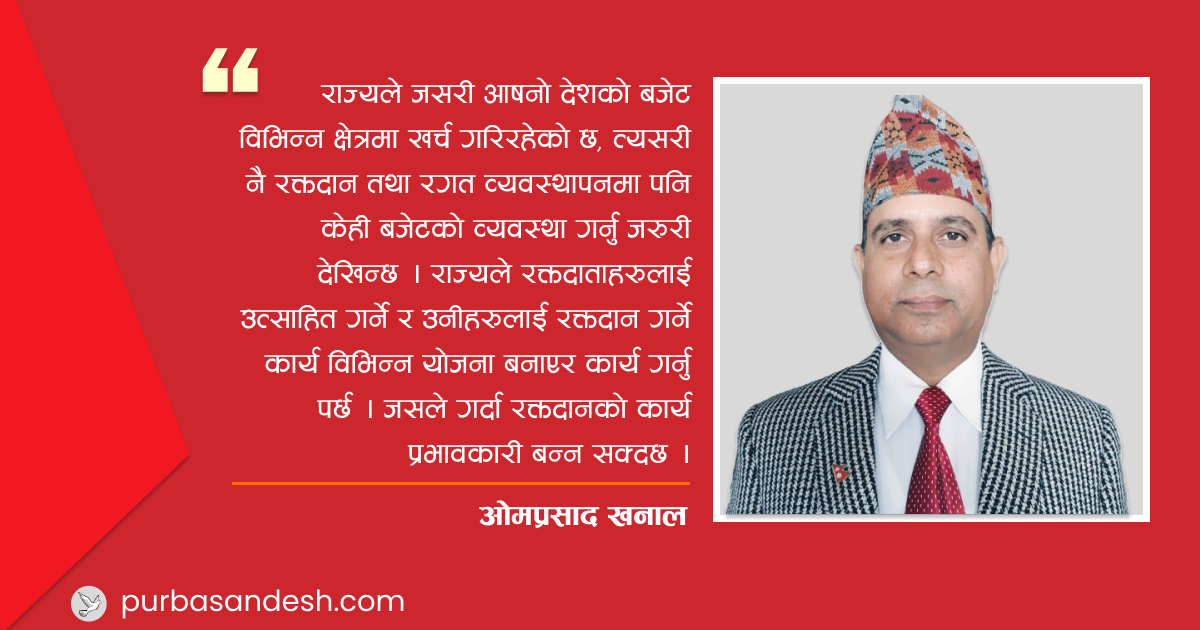 आज रक्तदाता दिवस । अर्थात रक्तदान दिवस । रक्तदान जीवन दान भनेर रक्तदाताहरुलाई हौसला र प्रेरणा दिने दिन । मानिसलाई रगतको महत्वको बारेमा बुझाउने दिन । आज विश्वभर रक्तदान दिवस मनाउने दिन । हरेक वर्ष जुन १४ तारिखलाई संसारभर रक्तदाता दिवसको रुपमा मनाइन्छ । मानव जातिको रक्त समूह पत्ता लगाउने बैज्ञानिक डा. कार्ल ल्याण्डस्टिनरको जन्म दिन १४ जुनको अवसर पारेर रक्तदाता दिवस मनाउने गरिन्छ । विश्व स्वास्थ्य संगठनले सन २००४ देखि यो दिवस मनाउन सुरु गरेको हो । यो दिवसलाई रक्तदान दिवस पनि भनिन्छ । यो दिवसमा रक्तदान गर्नु अति महत्वपूर्ण मानिन्छ । साथै यो दिवसका दिन जनचेतनामूलक कार्यक्रम सञ्चालन गर्नु, मानव शरीरको लागि रगतको महत्वको बारेमा जानकारी गराउनु, रगतको आवश्यकताको जानकारी गराउनु, रक्तदाताले पुर्याएको योगदानको चर्चा गर्नु र उनीहरुलाई धन्यवाद ज्ञापन गर्नु महत्वपूर्ण कार्य हुन जान्छ । साथै यो दिवस मनाउदा शरीरमा सुरक्षित रगत कसरी उत्पादन गर्ने, शरीरमा भएको रगतलाई नास हुन नदिन समय समयमा रक्तदान गर्ने, मानव शरीरका लागि रगतको आवश्यकताको बारेमा जानकारी गराउने, मानिसहरुलाई रक्तदान गर्न प्रोत्साहन गर्ने र रक्तदान गर्ने रक्तदाताहरुलाई धन्यवाद दिने कार्य समेत गर्नु पर्दछ ।