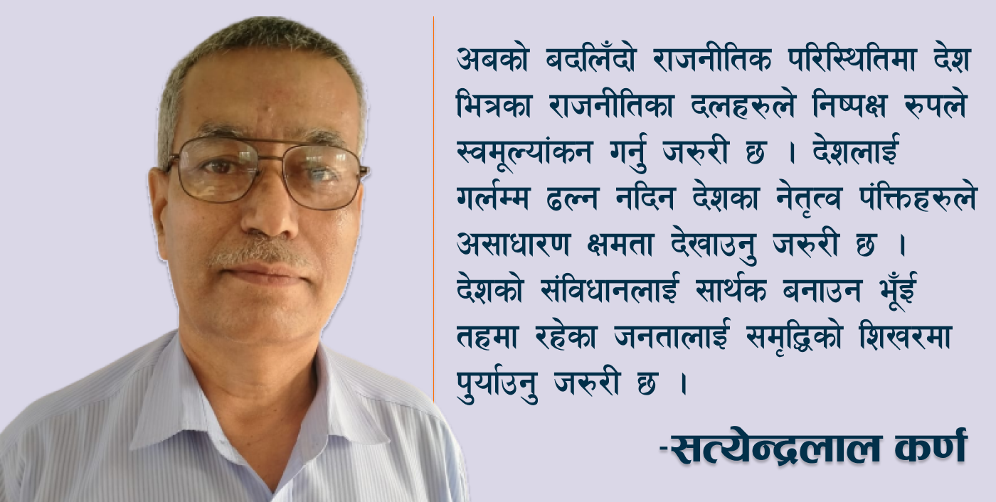 सरकार परिवर्तन गरेर देशको यथार्थ यथास्थितिमा कुनै पनि किसिमको नौलो हलचल र उद्विकास हुन सक्दैन भन्ने कुरा घाम झैँ छर्लङ छ । सर्वदलीय सरकार बनाउने परम्परा बसाल्न नसक्दा मनपरी तरिकाबाट सरकारमा जाने बाटो रोज्नु पर्दा देशको राजनीति र राजनीतिक अवस्थाहरु जनताको नजरमा झन् झन् अविश्वसनीय र अपत्यारिलो हुँदै गइरहेको देखिन्छ । नेपाली कांग्रेसबाट शेरबादुर देउवा, एमालेबाट केपी ओली, नेकपा मओवादीबाट प्रचण्ड जस्ता ठूला ठूला नेताहरुले देशलाई अग्रगमनमा लिएर जाने हौसला जुटाउन सकेको कहीँ कतैबाट पनि देख्न सकिएको छैन । देशको तरल राजनीतिक अवस्थाले देशलाई सुशासनको बाटोमा डो¥याउन सकेन भने देशलाई अधोगतिमा जान सक्ने अवस्थाबाट कसैले पनि बचाउन सक्दैन । पाखा लागिरहेका सिमान्तकृत विपन्न वर्ग तथा समुदायहरुलाई अन्न, जल र स्वास्थ्य तथा सुरक्षाको प्रत्याभूति गराउन सकिएन भने राजनीतिक दलहरुले रोजेको गन्तब्य निश्फल हुने अवस्था विद्यमान छ । नेपालमा बहुमतीय सरकार होस् वा सहमतीय सरकार नेपाली नागरिकलाई हाँस न बकुल्लो हुनबाट कसैले पनि रोक्न सकेको जस्तो लाग्दैन । नेपालमा जनआन्दोलन सफल भएपछि संविधानसभाबाट बनेको नयाँ संविधान करिब एक दशक पुग्न लागिसकेको छ । सरकारले अझैसम्म पनि संक्रमणकालिन न्यायलाई निरुपण गर्न नसक्दा देशभित्र मात्र होइन देश बाहिर पनि नेपाली नागरिकहरुको मानव अधिकारहरु बहाल हुनु पर्ने कुराहरुमाथि टिकाटिप्पणीहरु बढ्दै गइरहेको छ । देशका मानव निर्मित बेथिति र विसंगतिहरुसंगै बाढी पहिरो, भूकम्प, महामारी बढ्दै गएभनें देशमा अझ नयाँ नयाँ किसिमका समस्याहरु सृजना हुन सक्दछन् । सरकारले भ्रष्टाचारमाथि अंकुश लगाउन सक्ने आधारहरुलाई दिगो बनाउन सकेन भने सुशासन, विकास र आर्थिक समृद्धिको राजनीतिक दर्शन खोक्रो नै सावित हुन सक्दछ । नेपालका राजनीतिक दलहरुले देशलाई नयाँ युग, नयाँ लोकतन्त्र र नौलो संसदीय अभ्यासहरुको उचाइमा पुगेर लोक कल्याणकारी राज्यको संकल्पलाई पुरा गर्न सक्ने किसिमको आँटिलो सरकार बनाउनु पर्ने आवश्यकता रहेको छ । अबको बदलिँदो राजनीतिक परिस्थितिमा देश भित्रका राजनीतिका दलहरुले निष्पक्ष रुपले स्वमूल्यांकन गर्नु जरुरी छ । देशलाई गर्लम्म ढल्न नदिन देशका नेतृत्व पंक्तिहरुले असाधारण क्षमता देखाउनु जरुरी छ । देशको संविधानलाई सार्थक बनाउन भूँई तहमा रहेका जनतालाई समृद्धिको शिखरमा पुर्याउनु जरुरी छ ।