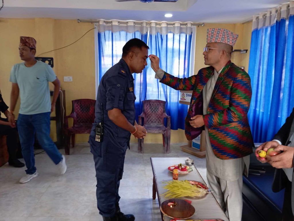 दमक । इलाका प्रहरी कार्यालय दमकका प्रमुख प्रहकरी नायव उपरीक्षक निशान थापाले कार्यरत कर्मचारीलाई विजया दशमीको टिका लगाई आर्शिवाद प्रदान गरेका छन् । थापाले विजया दशमीको शुभ साइतमै कार्यरत कर्मचारीलाई टिका लगाइदिएका हुन् ।