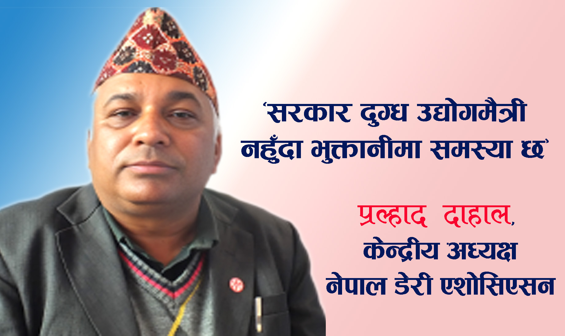 प्रल्हाद दाहाल, नेपाल डेरी एशोसिएसन केन्द्रीय कार्यसमितिका अध्यक्ष हुन् । डेरी एशोसिएसन कोशी प्रदेशको अधिवेशन पनि हालै झापाको दमकमा सम्पन्न भएको छ । अधिवेशनमा सहभागी हुन दमक रहेका बेला मौका पारेर समग्र दुग्धउद्योग, व्यवसाय, यसको उत्पादन, बजारीकरण, संभावना र चुनौती साथै दुग्धउत्पादक किसानको हक, हितका बारेका बारेमा उनै दाहालसँगपूर्वसन्देशका लागि खगेन्द्र कार्कीले गरेको कुराकानी यहाँ प्रस्तुत गरिएको छ ।