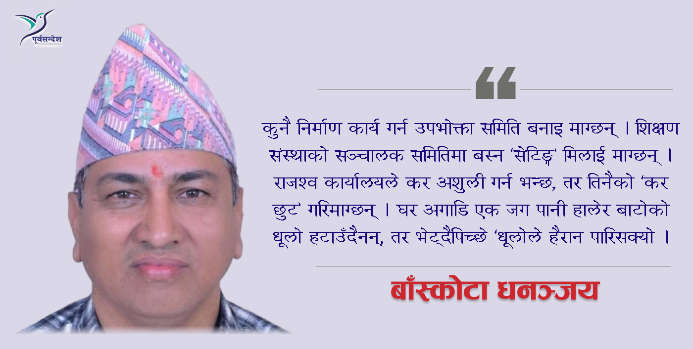 अनि तिनका अनगिन्ती ‘ल्याङ्गल्याङ्ग’ पनि सुन्नु, काम पनि गरिदिनु । अनि अलिकति केही ‘कमाइ’ गर्न खोज्यो भने दुनियाँ ‘पत्रुकार’ भेला गराएर उल्टै ‘भ्रष्ट’ को पगरी लगाइदिन तम्सिन्छन् ती ।
