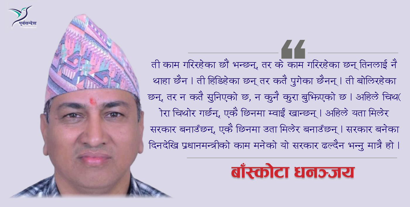 आज हाम्रो यो समय र परिवेशमा हामीले पाएका ती अमिर यतैतिर छन् । ती नेपाली जनता हुन् । लोकतन्त्र हो, एउटा न एउट दललाई भोट दिनै पर्छ जनताले । तर ती जनताको हुर्मत लिने काम गर्छन् । कार्यकर्ता पाल्न ऋणमा लग्छन् देशलाई । एउटा नागरिकले पाउने कुनै सुविधा छैन । आयकर ३ सय प्रतिशत तिरेर सवारी किन्छ जनता, सवारी कर तिर्छ जनता, तर कवाडी बाटोमा कुदाएर एक बर्षमा गाडी खराव बनाउनु पर्छ । अनि आप्mनै खर्चमा मर्मत गर्नु पर्छ । रोजगारी छैन, युवालाई बिदेशिनबाट रोक्ने कुनै चिन्तन छैन । परनिर्भरता र आयात बढेको बढ्यै छ । निर्यात छैन । राष्ट्रिय पूँजिको बिकास छैन । पूँजि निर्माण छैन । समाज, सामाजिक संस्थाहरूलाई र प्रत्येक व्यक्तिलाई दलीयकरण गरेर देशलाई गरूढको छाँयाको सर्प बनाइयो । न्यायधिस दलका, पत्रकार दलका, वकिल दलका, शिक्षक प्राध्यापक दलका, कर्मचारी दलका, मजदुर दलका, डाक्टर इन्जिनियर दलका, नर्स दलका, किसान दलका, बिद्यार्थी दलका, व्यापारी उद्योगपति दलका । जनता खोइ ?