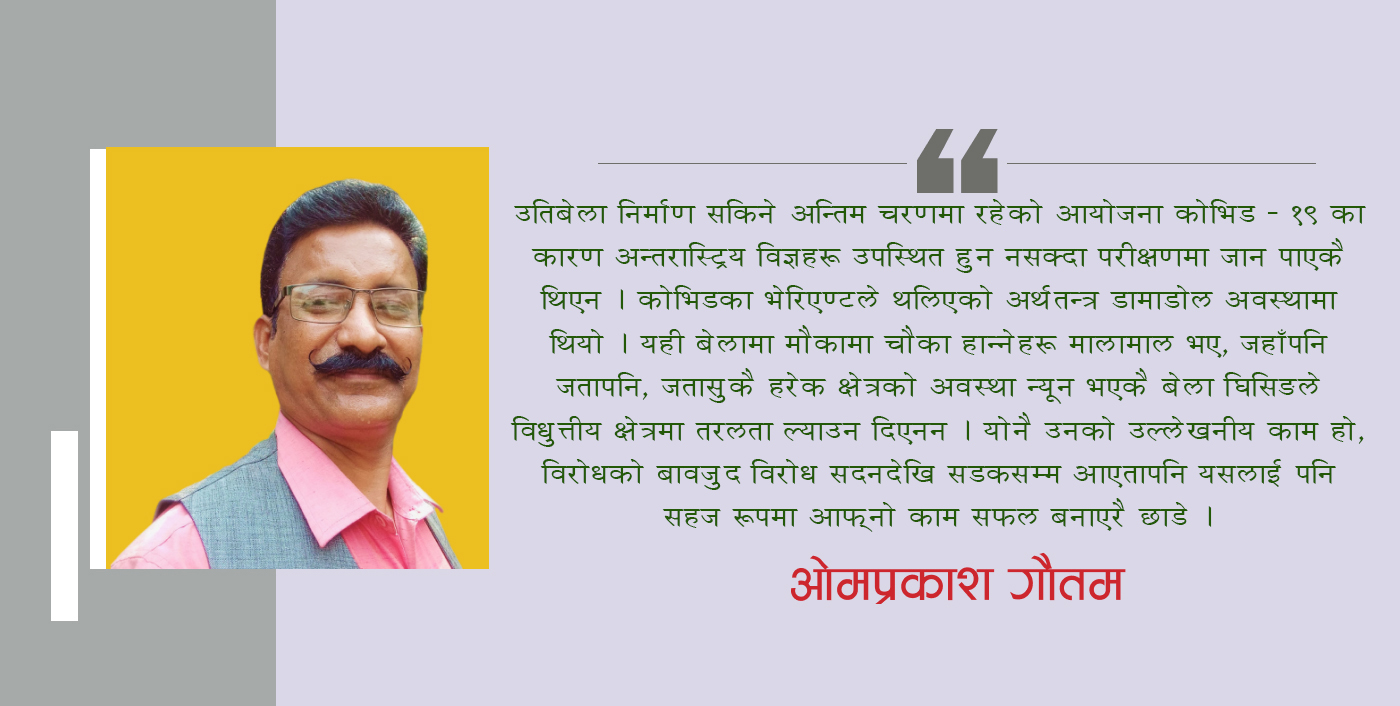 उतिबेला निर्माण सकिने अन्तिम चरणमा रहेको आयोजना कोभिड – १९ का कारण अन्तरास्ट्रिय विज्ञहरु उपस्थित हुन नसक्दा परीक्षणमा जान पाएकै थिएन । कोभिडका भेरिएण्टले थलिएको अर्थतन्त्र डामाडोल अवस्थामा थियो । यही बेलामा मौकामा चौका हान्नेहरु मालामाल भए, जहाँपनि जतापनि, जतासुकै हरेक क्षेत्रको अवस्था न्यून भएकै बेला घिसिङले विधुत्तीय क्षेत्रमा तरलता ल्याउन दिएनन । योनै उनको उल्लेखनीय काम हो, विरोधको बावजुद विरोध सदनदेखि सडकसम्म आएतापनि यसलाई पनि सहज रुपमा आफ्नो काम सफल बनाएरै छाडे । इतिहासमा कसैले गर्नै नसकेको काम उनले रेकर्ड कायम गरेरै छाडे । यस्तो उदाहरणीय कार्यगर्दा सम्म उनलाई राजनीतिक रङ्ग दिएर जग हसाउने काम एमाले, काङ्ग्रेस जस्तो ठूलो पार्टीका शीर्ष नेताहरूले मात्र गरे तर धेरैले उनलाई स्याबासी दिए ।