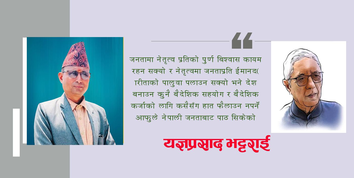 जनतामा नेतृत्व प्रतिको पुर्ण बिश्वास कायम रहन सक्यो र नेतृत्वमा जनताप्रति ईमानदारीताको पालुवा पलाउन सक्यो भने देश बनाउन कुनै बैदेशिक सहयोग र बैदेशिक कर्जाको लागि कसैसँग हात फैलाउन नपर्ने आफुले नेपाली जनताबाट पाठ सिकेको बताएका छन् ।