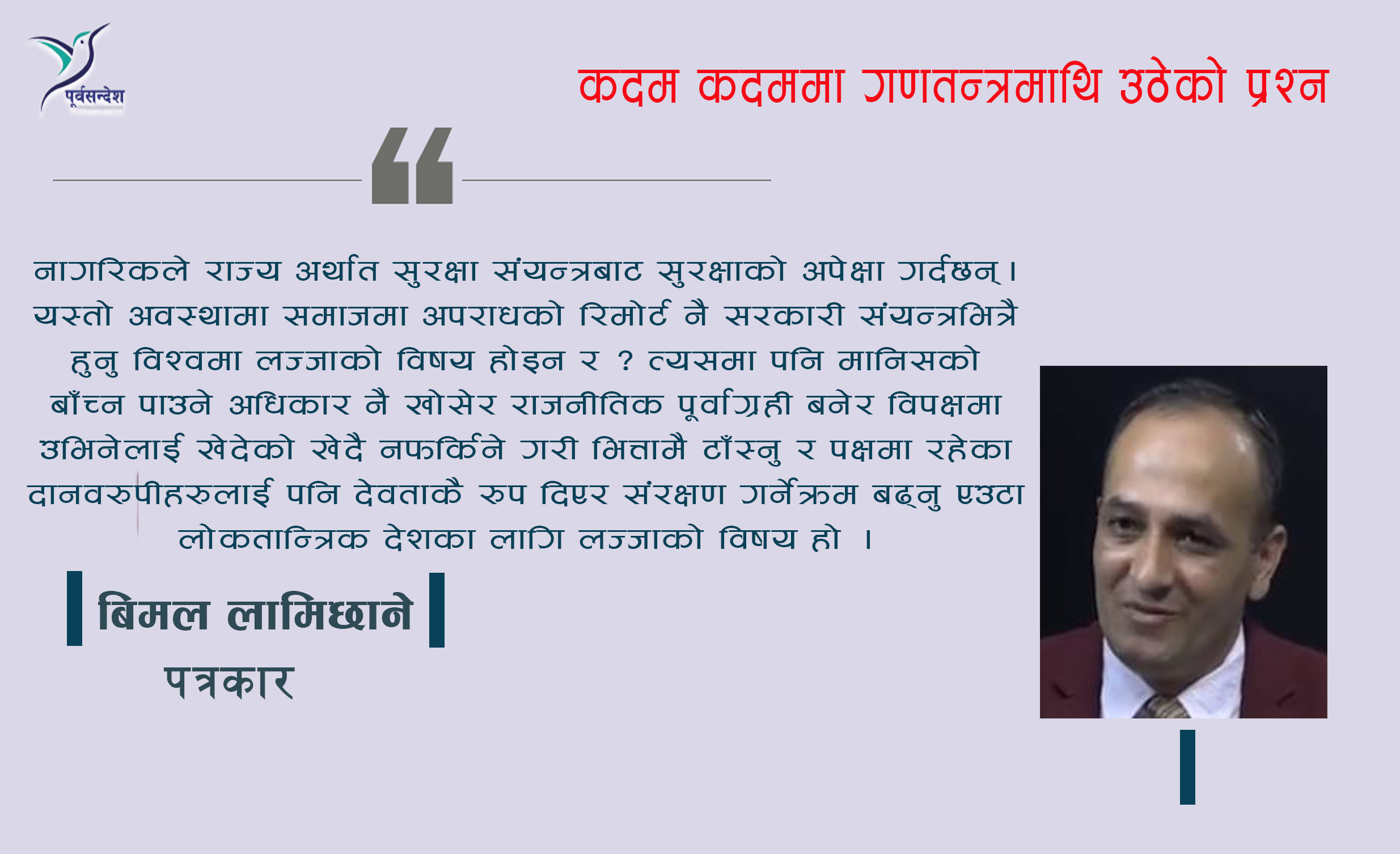 नागरिकले राज्य अर्थात सुरक्षा संयन्त्रबाट सुरक्षाको अपेक्षा गर्दछन् । यस्तो अवस्थामा समाजमा अपराधको रिमोर्ट नै सरकारी संयन्त्रभित्रै हुनु विश्वमा लज्जाको विषय होइन र ? त्यसमा पनि मानिसको बाँच्न पाउने अधिकार नै खोसेर राजनीतिक पूर्वाग्रही बनेर विपक्षमा उभिनेलाई खेदेको खेदै नफर्किने गरी भित्तामै टाँस्नु र पक्षमा रहेका दानवरुपीहरुलाई पनि देवताकै रुप दिएर संरक्षण गर्नेक्रम बढ्नु एउटा लोकतान्त्रिक देशका लागि लज्जाको विषय हो ।