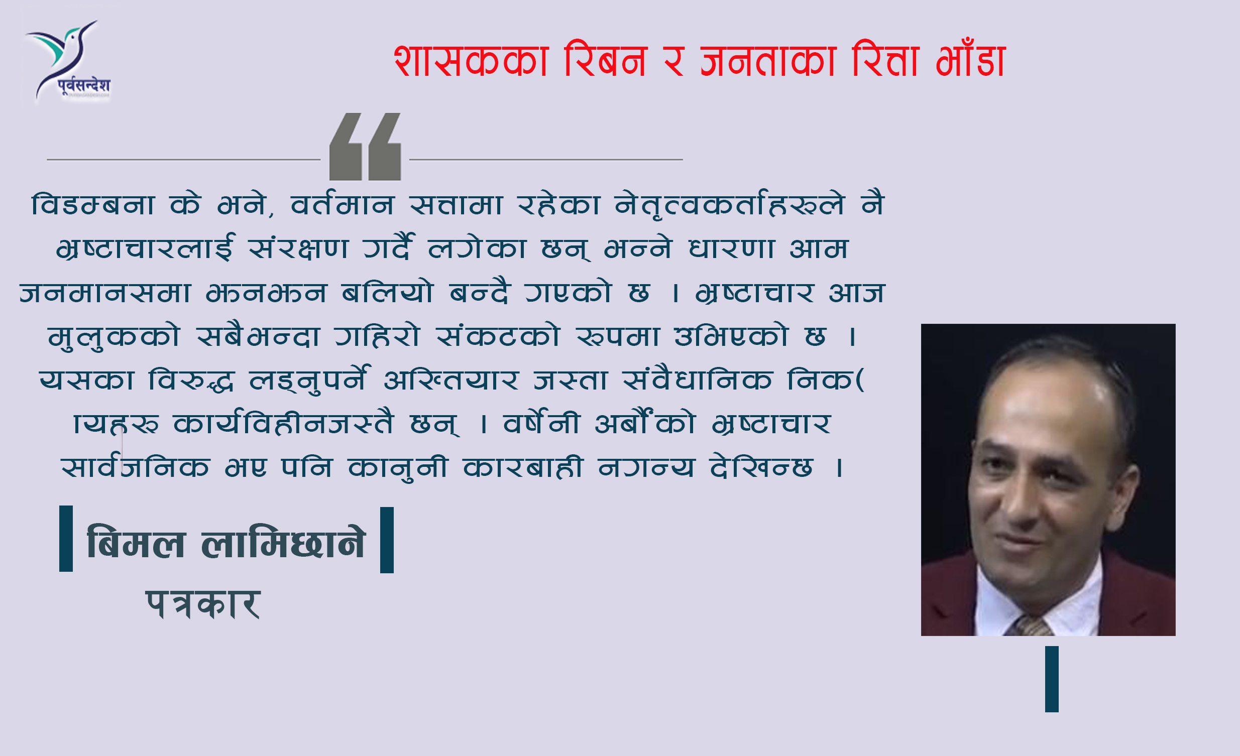 विडम्बना के भने, वर्तमान सत्तामा रहेका नेतृत्वकर्ताहरूले नै भ्रष्टाचारलाई संरक्षण गर्दै लगेका छन् भन्ने धारणा आम जनमानसमा झनझन बलियो बन्दै गएको छ । भ्रष्टाचार आज मुलुकको सबैभन्दा गहिरो संकटको रूपमा उभिएको छ । यसका विरुद्ध लड्नुपर्ने अख्तियार जस्ता संवैधानिक निकायहरू कार्यविहीनजस्तै छन् । वर्षेनी अर्बौंको भ्रष्टाचार सार्वजनिक भए पनि कानुनी कारबाही नगन्य देखिन्छ ।