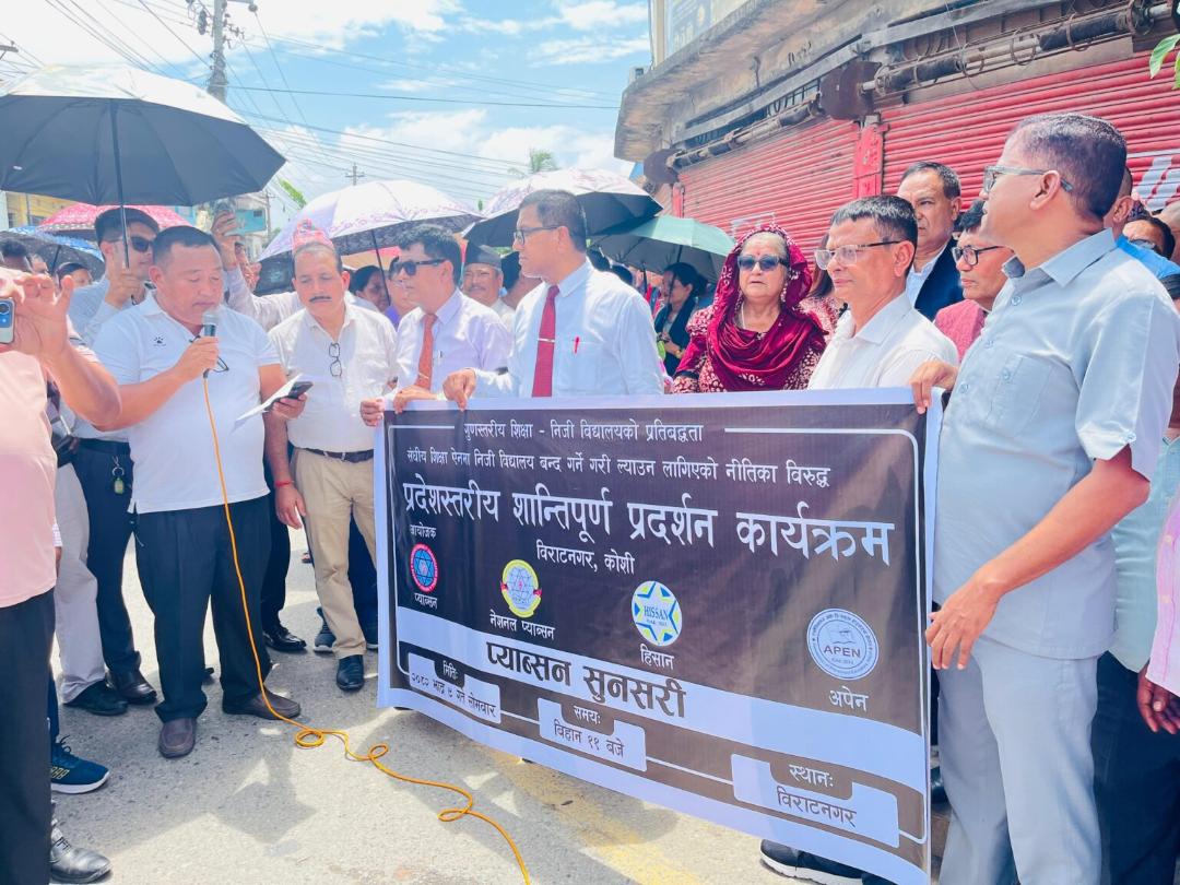 शिक्षा विधेयकको विरोध गर्दै कोशी प्रदेशको विराटनगरमा पनि प्रदर्शन गरिएको छ । निजी विद्यालय बन्द गर्ने गरी संघीय शिक्षा ऐन ल्याउन लागिएको भन्दै विरोध प्रदर्शन गरिएको हो । विराटनगरमा प्याब्सन, एन–प्याब्सन, हिसान र अपेनको संयुक्त आयोजनमा हातमा कालो पट्टी बाँधेर विरोध प्रदर्शन भएको हो ।