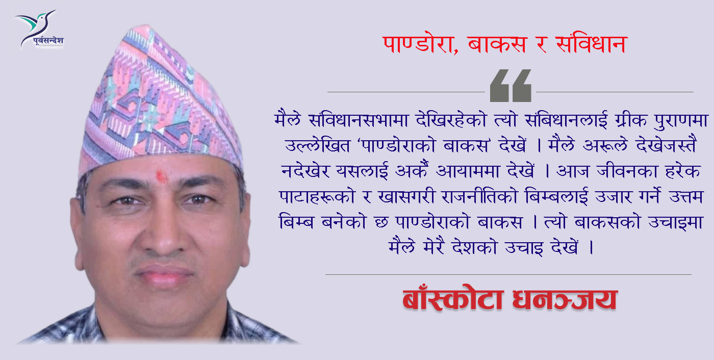 तर मैले संविधानसभामा देखिरहेको त्यो संबिधानलाई ग्रीक पुराणमा उल्लेखित ‘पाण्डोराको बाकस’ देखें । मैले अरुले देखेजस्तै नदेखेर यसलाई अर्कै आयाममा देखें । आज जीवनका हरेक पाटाहरुको र खासगरी राजनीतिको बिम्बलाई उजार गर्ने उत्तम बिम्ब बनेको छ पाण्डोराको बाकस । त्यो बाकसको उचाइमा मैले मेरै देशको उचाइ देखें ।