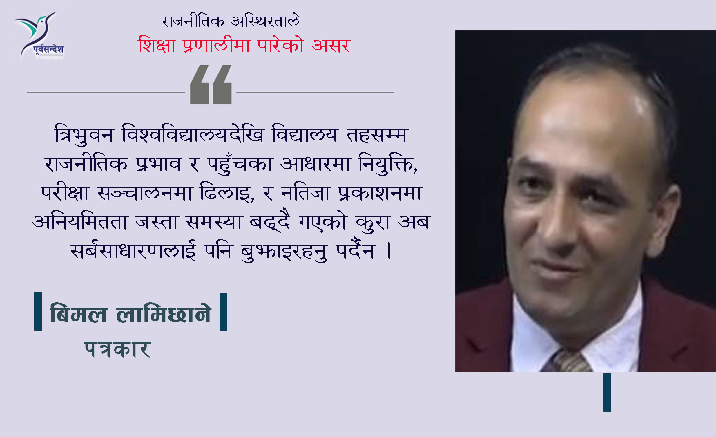 त्रिभुवन विश्वविद्यालयदेखि विद्यालय तहसम्म राजनीतिक प्रभाव र पहुँचका आधारमा नियुक्ति, परीक्षा सञ्चालनमा ढिलाइ, र नतिजा प्रकाशनमा अनियमितता जस्ता समस्या बढ्दै गएको कुरा अब सर्बसाधारणलाई पनि बुझाइरहनु पर्दैन ।