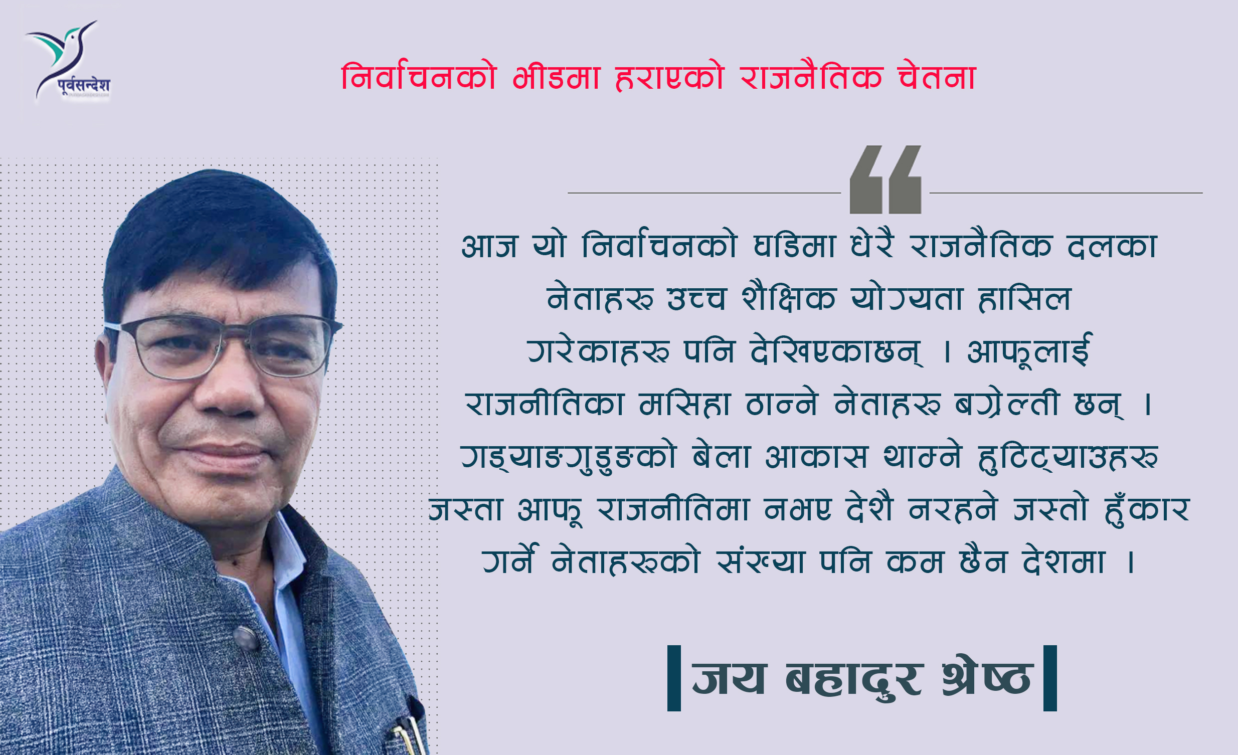 आज यो निर्वाचनको घडिमा धेरै राजनैतिक दलका नेताहरू उच्च शैक्षिक योग्यता हासिल गरेकाहरू पनि देखिएकाछन् । आफूलाई राजनीतिका मसिहा ठान्ने नेताहरू बग्रेल्ती छन् । गड्याङगुडुङको बेला आकास थाम्ने हुटिट्याउहरू जस्ता आफू राजनीतिमा नभए देशै नरहने जस्तो हुँकार गर्ने नेताहरूको संख्या पनि कम छैन देशमा । तर बोलि बचन, व्यवहार, एकले अर्कोलाई गर्ने मान–सम्मान हेर्दा उहाँहरूमा राजनैतिक संस्कारको कुरा त धेरै पर, राजनैतिक चेतना नै नभएको आभाष हुन्छ । लाज नमानी भन्नुपर्दा नेताहरू नुवाकोटमा पर्वको रूपमा जुधाईने साँढे जस्तो फाक्क–फुक्क, हाक्क–हुक्क गर्ने प्रकृतिको देखिनु हुन्छ ।