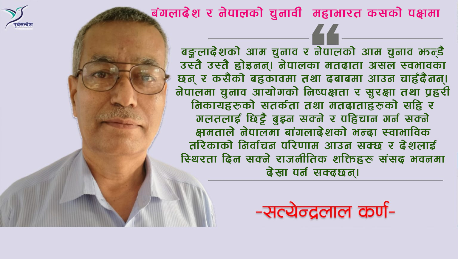 बङ्गलादेशको आम चुनाव र नेपालको आम चुनाव झन््डै उस्तै उस्तै होइनन्। नेपालको राजनीतिक दललाई नेपालका उदारवादी र समावेशी राजनीतिक विचारकहरूले नेतृत्व गरिरहेका छन् र चुनावमा भाग लिने सबै राजनीतिक दलहरूको प्रमुख मुद्दा शून्य भ्रष्टाचार र विकास नै रहेको छ। नेपालका मतदाता असल स्वभावका छन् र कसैको बहकावमा तथा दबाबमा आउन चाहँदैनन्। नेपालमा चुनाव आयोगको निष्पक्षता र सुरक्षा तथा प्रहरी निकायहरूको सतर्कता तथा मतदाताहरूको सहि र गलतलाई छिट्टै बुझ्न सक्ने र पहिचान गर्न सक्ने क्षमताले नेपालमा बांगलादेशको भन्दा स्वाभाविक तरिकाको निर्वाचन परिणाम आउन सक्छ र देशलाई स्थिरता दिन सक्ने राजनीतिक शक्तिहरू संसद भवनमा देखा पर्न सक्दछन्। नेपालमा पुराना अनुहारका राजनीतिक शक्ति र नयाँ अनुहारका राजनीतिक शक्तिहरू बीचको चुनावी संघर्षको परिणाम कसको पक्षमा आउला भन्ने कुरामा अब लामो समयसम्म पर्खिनु पर्दैन होला ।