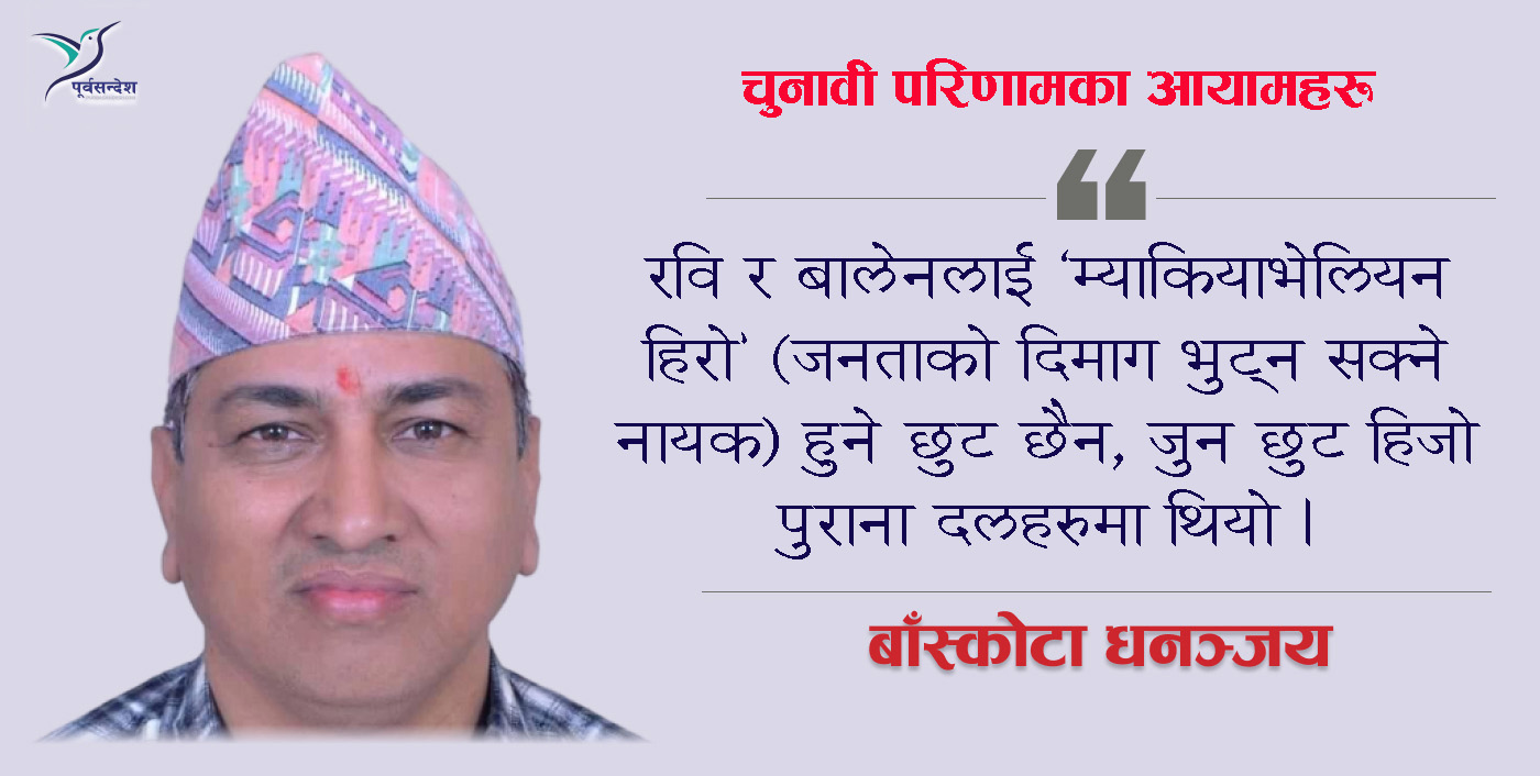 यो चुनावले ‘गरिवीलाई पालिराखेर त्यसलाई भोटब्याङ्क’ बनाउने पुराना दलहरूको सुकुम्वासी, दलित, आदिवासी, मधेसी, मजदुर, बिपन्न र पछाडिएको वर्ग, सर्वहारा, कम्युनिष्ट, प्रजातन्त्रवादी, क्षेत्रियता जस्ता नाम भजाएर संधै चुनाव जित्ने र जितिन्छ भन्ने मान्यतालाई ध्वस्त पारिदियो । यो चुनावले ‘सबै मानिस कानूनका अगाडि समान हुन्’ भन्ने रूशोको सर्वव्यापी लोकतान्त्रिक मान्यतालाई पनि स्थापित गरिदियो । यी भोट बटुल्ने पुराना दलहरूका ‘दुकान’ हरू बन्द गरिदिएको छ । अब ‘सबै नेपाली’ भन्ने आदर्श स्थापित भएको छ । दलहरूका कतिपय एजेण्डाहरूले ‘म नेपाली हुँ’ भन्न हिच्किचाएर ‘म मधेसी, म थारू, म आदिवासी, म फलानो’ भन्ने बनाइसकेको थियो । यो घातक बीषले शरीर ढाक्नुभन्दा पहिला रास्वपाले यो परिणाम ल्याएर त्यो बीषलाई शरीरमा पैmलिनबाट रोक्न सफल भएको छ । त्यतिमात्र्रै होइन, ‘उपल्लो जातका मानिसले हामीमाथि शासन गरेर हाम्रो पहिचान मेटाए, हामीलाई दोस्रो दर्जाको नागरिक बनाए, हामीमाथि शोषण गरे’ भनेर समाजमा जातीय बिभाजन कोरेर ‘चुनाव जित्न सफल’ धन्धुकारीहरूलाई एउटा मधेसी केटालाई प्रधानमन्त्रीको प्रस्ताव गरेर रवि लामिछानेले ती दलहरूको ‘धन्दुकारी दुकान’ लाई ध्वस्त पारिदए ।